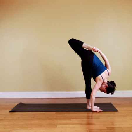 ● 从侧身展式开始,将双手放于右脚两侧。弯曲前面这只腿的膝盖,慢慢的把左脚向上伸,直到形成单腿前屈伸展式。保持这个动作,或者将左腿的膝盖弯曲来加强伸展左腿的**。保持双手撑地或者也可以用左手臂拉住左脚,尽量用左脚跟靠近**,保持膝盖极力向上。