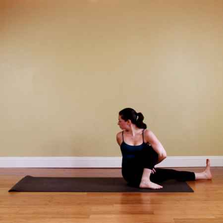 ● 将双手放松,同时撑在右腿的右侧。弯曲左侧膝盖,两腿并拢,抬起**。这样**身体还是扭曲着的。双手臂弯曲,将右胯放于右手肘上,右膝盖外侧放于左手肘上。将重心移至双手,双脚离开地面,左脚向后伸直。
