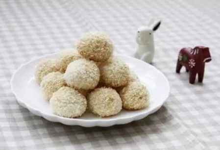 6、把小球在椰丝里滚一下,让小球的表面均匀沾上椰丝(此步可省略)。