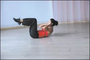 双腿抬起与地面成90度,双手放在耳边,收紧腹部