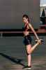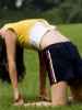 3、身体继续向前弯曲至双手手掌撑地,眼望下方呈准备姿势。