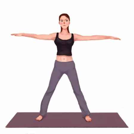 深呼吸,跳步分开双腿,双臂平举与肩齐,手掌朝下,手臂与地面平行.