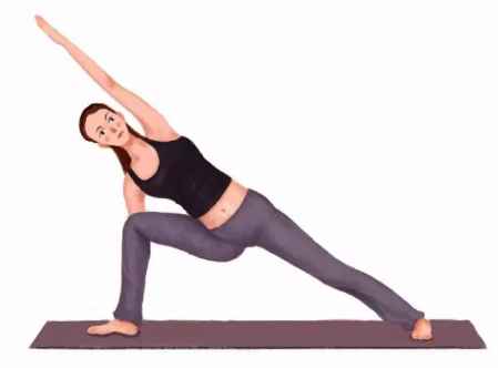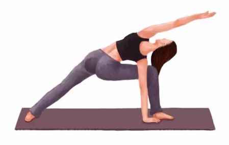 曲右腿,大小腿成直角,**与地面平行; 右掌贴近右脚一侧地面,右腋紧贴右膝外侧;左耳上方,完全伸展左臂,头部朝上。