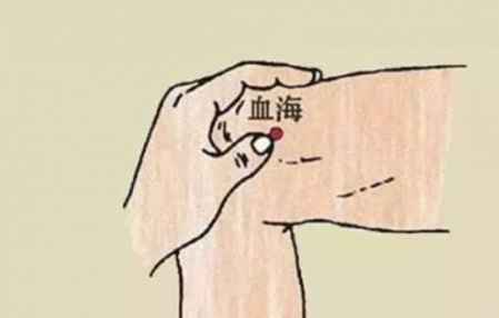 血海位于髌骨内上缘上方6-7毫米处。取穴时,患者屈膝,医者以左手掌心按于患者右膝髌骨上缘2-5指,向上伸长,拇指约呈45℃斜置,拇指尖下即是穴位。