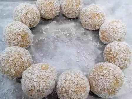 3、取一小块面团,揉成大约2厘米直径大小的圆球,再滚上椰蓉,放在烤盘上(烤盘上铺锡纸或者烤纸)。