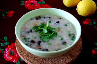 材料:香菇5朵,鸡肉丝100克,玉米粒40克,红萝卜60克,新鲜莲子30克,红枣8个,白米75克,芡实、山药各15克,盐适量,姜母3片,青葱2根,胡椒粉酌量。