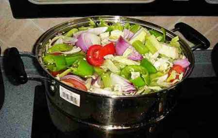 做法:洋葱、青辣椒、番茄、包菜用水冲洗干净,切成块状。芹菜洗净,切成斜段。然后将以上5种菜放入大煲内,加满清水,翻滚后,慢火煲3小时左右,余下汤水即可,汤水可浓可淡,可用盐调制自己喜欢的味道,但不能放入动物油类。