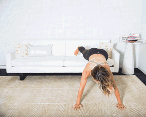 与沙发取得适当**后,将手掌平放于地面,再将双腿踩在沙发上,身体打直,同手同脚左右移动。