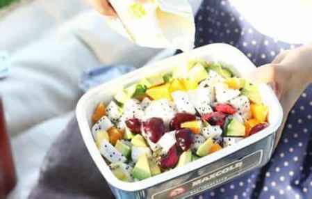 做法:将**、葡萄、圣女果分别清洗干净,荔枝剥皮去核,用沙拉酱调拌均匀,最后加入**汁。