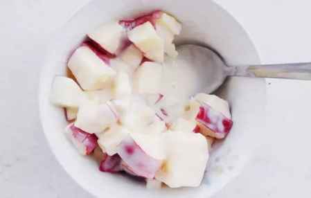 做法:苹果洗净,切块放入锅中煮至软熟,捞出;盛在盘中,加上5毫升蜂蜜搅拌;在酸奶中加入5毫升蜂蜜,再浇上酸奶即可。
