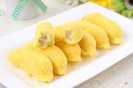 1.把香蕉切成小块,并拌上沙拉酱。