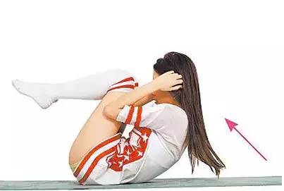 Step2.腹部收紧,上身离地,腿不动,尽量使双手手肘往前超过膝盖后停留1秒回动作1,重复20下有助腹部紧实。