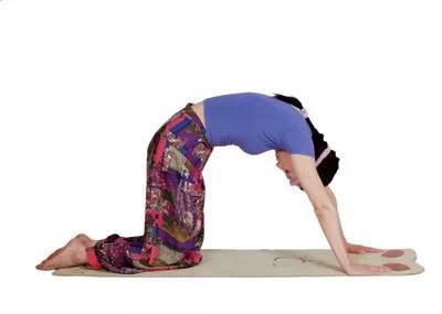 呼气,放松颈部,垂头、含胸、收缩腹肌,拱起后背,保持6秒钟。