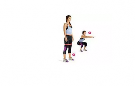 tips:利用一根弹力带,双脚**分开,与肩同宽,下蹲,注意膝盖不能超过脚尖!。