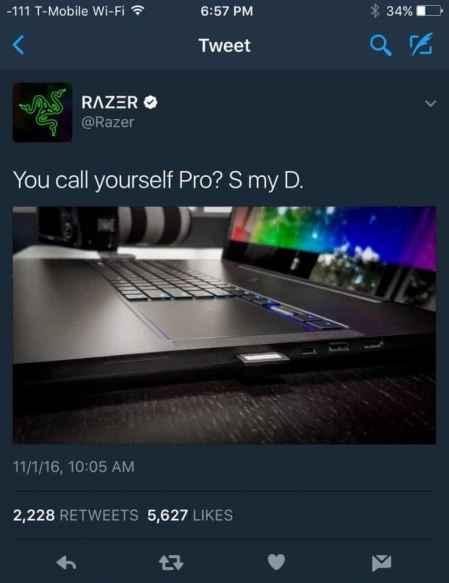 雷蛇通过官方Twitter发布了一张Blade Pro的机身接口特写照片,并配文“你敢叫自己Pro?”言语之中充满了对新MacBook Pro的调侃,因为苹果在新一代MacBook Pro上取消了SD卡槽,并且统一使用Type-C接口来整合视频输出、数据传输功能。