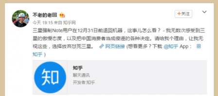 在@不老的老回发布的微博配图中可以清晰的看到与三星客服的对话,对方表示最晚的退机时间为2016年12月31日,若逾期不退,出现问题由消费者自行承担。不过打脸的是,三星中国总部售后经理此前曾经表示12月31日并非强制时间,也就是说,消费者可以选择任何时间退机,三星都应该无理由接受。