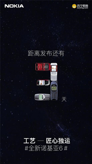 01-03 阅读(533)1月2日,苏宁手机官方正式宣布:距离诺基亚新品发布会倒计时3天。本次发布的新品是全新的诺基亚6,官方号称“匠心独运”。