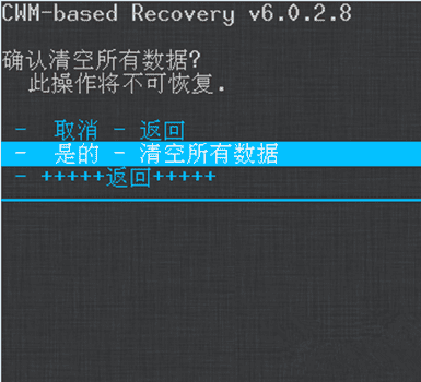 利用音量+键与音量-键进行上下移动,选择“wipe data/factory reset”指令,中文意思是“清空所有数据”。