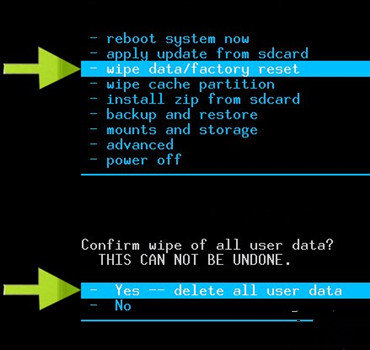 再选择yes - delete all user data指令,中文意思是“是的--清空所有数据”,确认即可开始进行恢复出厂设置。完毕后再选择“reboot system now”指令进行重启手机即可。此时就完成所有操作了。
