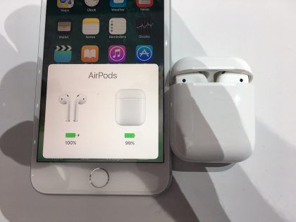 那么如何将 AirPods 配对到非苹果设备呢?据悉,AirPods 的配对按键位于 AirPods 的充电盒内,而非耳机身上。至于查看 AirPods 和充电盒的电量,你只需将耳机放在充电盒内,然后放置在所连接设备的旁边就可以了(如图)。
