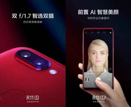 和上一代的OPPO R11一样,R11s也是配备前后2000万像素镜头,支持AI美颜算法。后置镜头采用2000万像素+1600万像素智选双摄组合,双F/1.7大光圈。OPPO在发布会上表示,这个双摄组合没有主副镜头之分,系统会根据拍照环境的不同自动选择合适的镜头做主成像镜头拍照,并且支持梯度虚化,让背景虚化更加柔和真实。