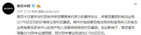 话说回来,索尼在10月31日下午宣布,与**制作所签署具有约束力的最终协议,将索尼集团的电池业务以175亿日元的价格转让给**集团。其中包括索尼电池相关制造场所以及电池业务销售及研发中心的资产和人员都将转移到**集团。在此影响下,索尼宣布调整2016财年业绩预期,预计财年营业利润为2700亿日元。