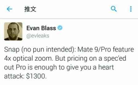 而在大家关注的手机价格方面,爆料大神@evleaks此次则在推特上表示,华为Mate 9 Pro的售价会让你心脏病发作,将会高达1300美元,换算**民币大约在8800元左右。为此,网友分析这个价格有可能是搭配了华为智能手表的尊享版的售价。