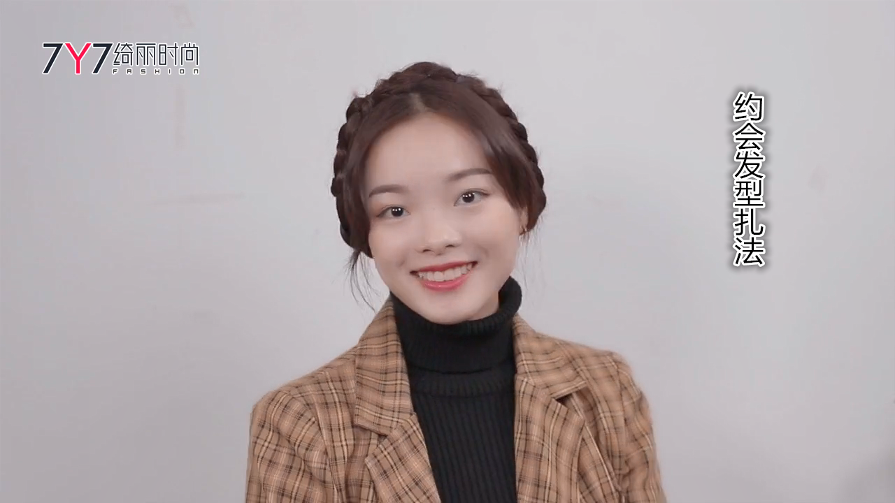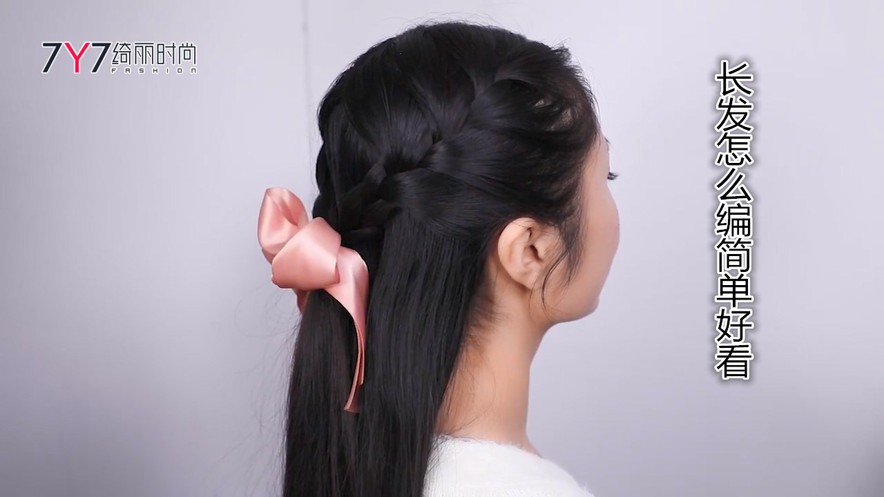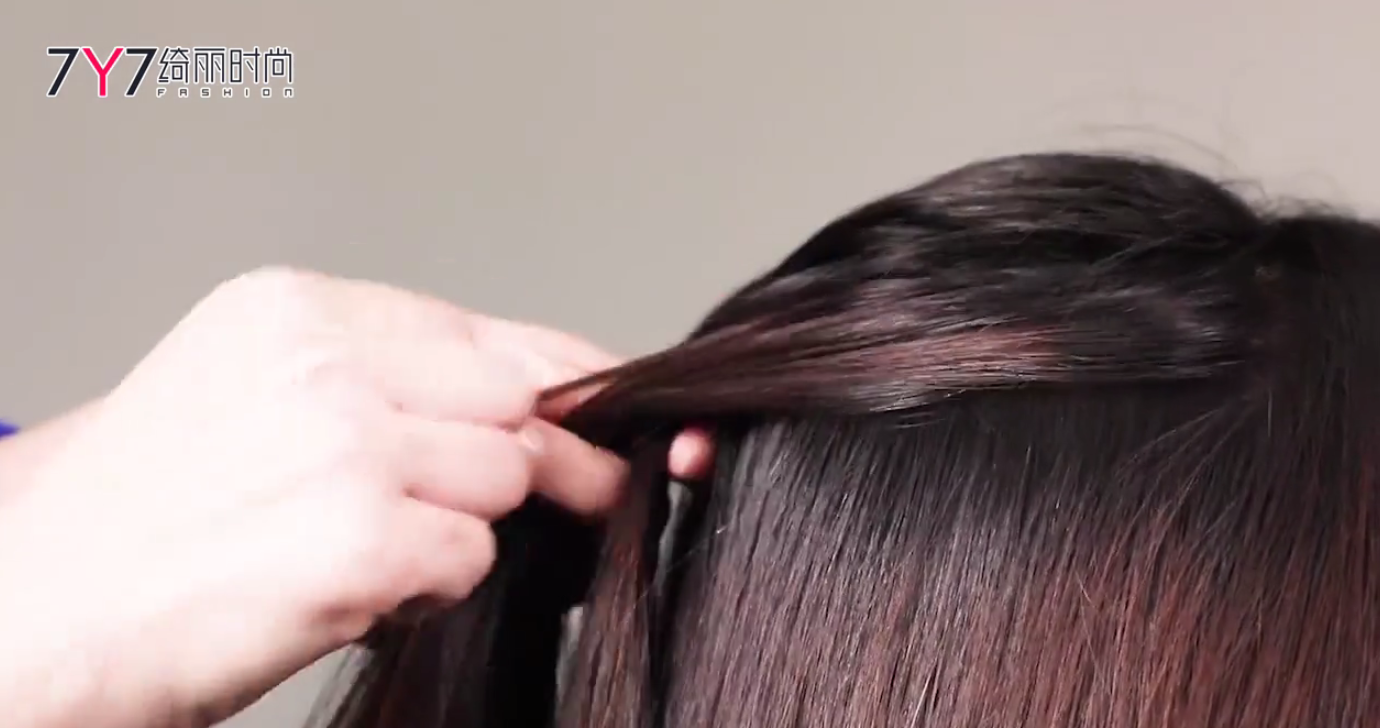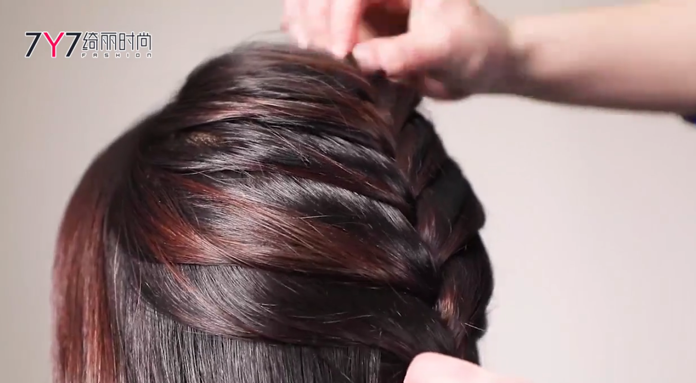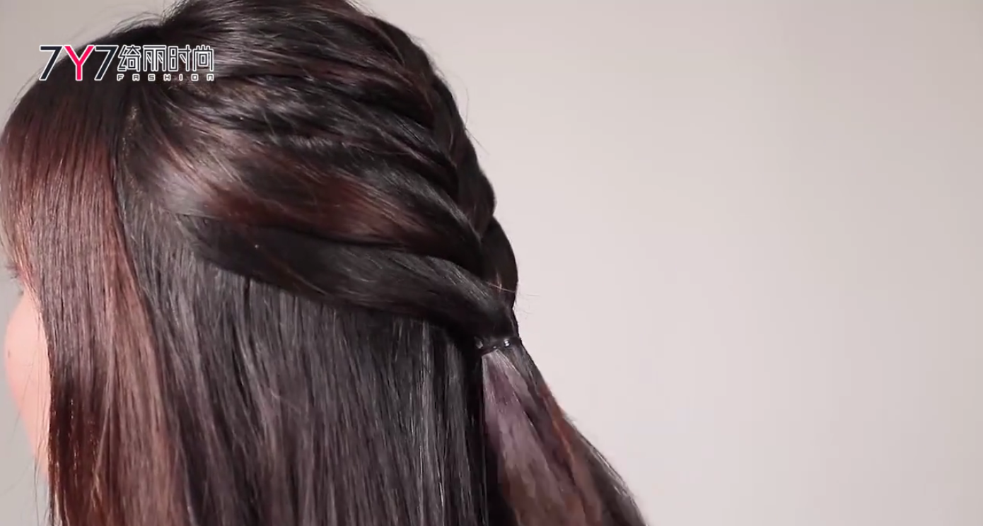 这3股发束编简单的麻花辫,当3股发束第一次互相交叉后,从旁边再取一小搓发束,纳入已有的3股发束中任意一股(与相近的发束相合)