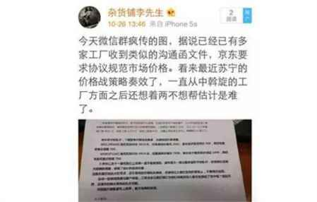 在“平京战役”还未全面打响之际,苏宁的低价策略就已经让**感到“肉痛”。今天(10月26日),有商家爆料称,微博名为“杂货铺李先生”贴出的一张**的“投诉”截图,主要内容就是:**向西门子等家电厂家投诉“苏宁价格低到离谱”,要求厂家约束苏宁的低价行为,实则变相要求苏宁涨价。