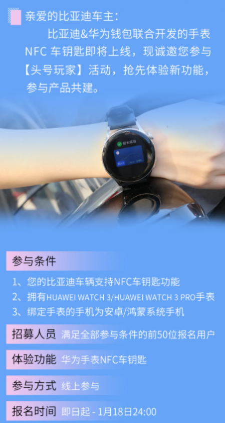 很快就可以支持了。比亚迪和华为钱包一起开发了一款手表NFC车钥匙,目前正在招募用户体验,活动到1月18日24:00截止。以后,用户就可通过华为WATCH 3/ 3 Pro等手表来给比亚迪车辆解锁,感兴趣的车主可以在微信公众号“比亚迪 DiLink”报名试用。在以前,比亚迪汽车的NFC车钥匙仅支持官方NFC卡片和部分NFC安卓手机,如华为、小米、OPPO、vivo、一加、realme、荣耀。
