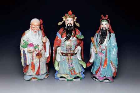 “福星”手抱小儿,象征有子万事足的福气。“禄星”身穿华贵朝服,手抱玉如意,象征加官进爵,增财添禄。“寿星”手捧寿桃,面露幸福祥和的笑容,象征安康长寿。福禄寿三星中,本来只有“禄星”才是财神;但因为三星通常是三位一体,故此福、寿二星也因而被人一起视为财神供奉了。倘若把福、禄、寿三星摆放在财位内,有这三星拱照,满堂吉庆,撇开风水不谈,单是视觉上及心理上也会觉得十分舒服的。担任文职的,以及受雇打工的人均宜摆放或供奉文财神;至于那些经商做老板,以及当兵当差从事武职的人,则应该摆放或供奉武财神。