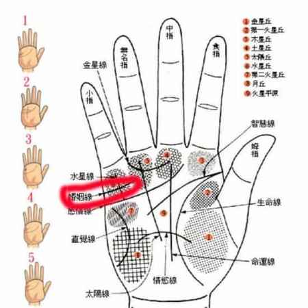 1.金星带靠近感情线;心情容易沉迷、不开朗;金星带纹路清楚,则破财少,若线较为溷杂则不良。