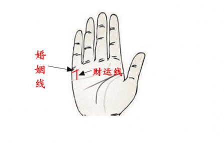 如果一个人的手相财运线上有横纹,而且这个横纹清晰可见,大约位于小指根部掌边的位置(如图),那么这个横纹很可能是婚姻线。拥有这种手相的人,个性外向、热情积极,属于婚后在财运和爱情双丰收的手相。