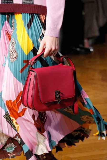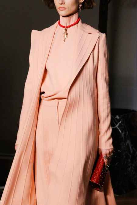 Piccioli 除了运用 Valentino 经典的粉红色还有红色贯穿秀场,这次还出现了许多繽纷的冰泣淋色,像是奶黄、蜜橘、薄荷绿等,让秋冬大季多了点活泼的色彩。灵感来自**艺术家 Nathalie Du Pasquier 温柔流畅的油画作品。