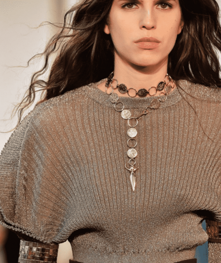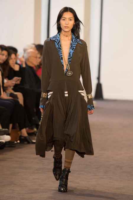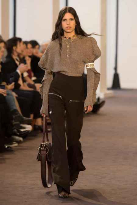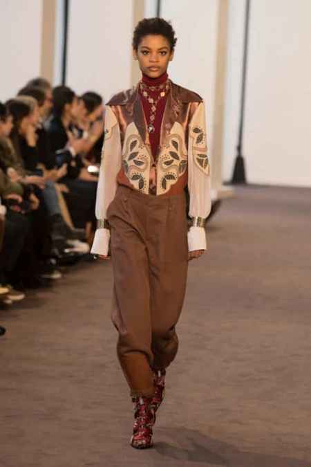 本次绣上集结名模Jean Campbell 、 Vittoria Ceretti 、 Rianne van Rompaey 、 Kaia Gerber 、刘雯等优雅得体且不失率性的Chloé 女郎,在尝试解读年轻女性的二元性与对立面基础上,诠释出一番Chloé 式新态度。系列中可看到纤细而性感的连身裙让人过目难忘,还有柔滑的牛仔衬衫和超大号骑行裤,其中高腰宽腿裤的款型采用现代主义手法改造,有独特的低腰细节设定。另外,亮眼金属配饰亦爲本季一大亮点,感性裙装上嫁接金属配件或亮片蕾丝,满载个性。