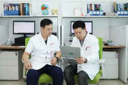 整形医院烧伤与创面修复科主任苏映军(左)主治医师付德丰(右)查看患者病例