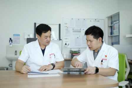 图:苏映军主任与付德丰医生查看病人患处手术条件