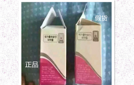 另外,从这张粉毒真假对比图片中,我们可以看出,真的粉毒外包装盒子侧面右上角的温度标示是比较浅淡的,而假货粉毒的盒子侧面温度标示颜色更浓。