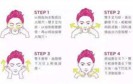 以拇指为指点抵住太阳穴,双手成钩状。然后用拇指侧边轻压颧骨,再用拇指按摩太阳穴部位。双手呈钩状,靠在颧骨下方,轻轻朝两侧滑动,同时慢慢施加力度来按压按摩。双手握拳,然后有脸颊下方往上轻轻上推按摩。拇指压在耳朵下面,双手轻轻握拳靠在下颚尖端,然后由下巴往耳朵下面滑动按摩。
