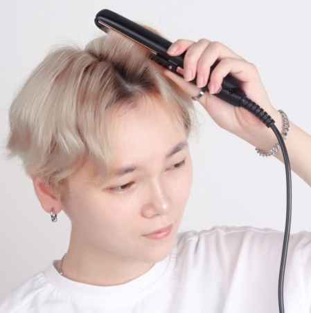 纹理烫发型不能把头顶打理的太高,有一定的蓬松感就可以,主要是不要让发根贴在头皮上。清洗完头发之后用毛巾轻轻擦干,先用大一点的风速把头发吹到八分干左右,再用小风速定型。开始快速吹干的时候大体先顺着发流吹,左边头发往右吹,右边头发往左吹。后边就使用小风速进行细节的整理。把头顶的头发先吹蓬松,然后用热风仔细整理发丝的走向,注意这个时候吹风机的方向是向下的。