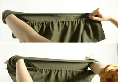 4、穿时让橡皮筋在手下穿过,这样即可固定住露肩衫,怎么动衣服都不会再往上弹。