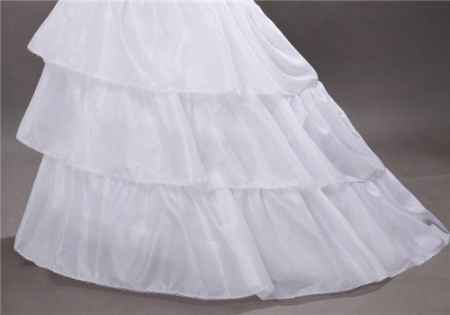 带大拖尾的婚纱宜选用拖尾裙撑。裙撑纱的层数越多,则能撑起婚纱的效果越好。如感觉带钢圈的裙撑不方便(坐下或其它大幅度动作等),宜选用无钢条裙撑或束腰裙撑。鱼尾款或直身款婚纱不宜用裙撑。