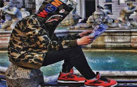 BAPE最出名的三个元素就是迷彩、鲨鱼头和logo的猿人头,其中鲨鱼头是运动在衣服上一个很常见的元素,这本身是一种战斗机喷绘,增加了衣服的潮流感。