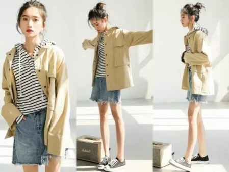如果矮个子说上一款的穿搭压根不符合我们的身高,那么这一套绝对合适哟,同样还是卡其色的风衣,不过这款是短款版型的,比起长款的更显得简约利落多了,配上条纹连帽卫衣,搭配上半身牛仔裙+帆布鞋,充满青春活力的装扮有木有?