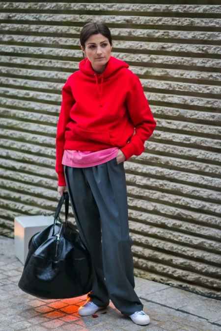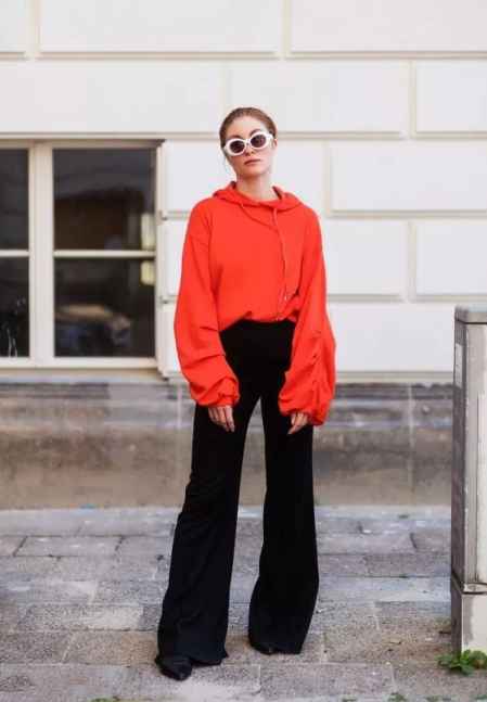 除了常见的黑白灰,你也可以选择一件亮色的卫衣。特别推荐红色和橙红色,显白又抢眼。