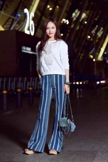 小花宋祖儿纯白色搭配今年流行色紫外光色的阔腿裤,清新亮眼,半**头更是减龄,青春靓丽哇~