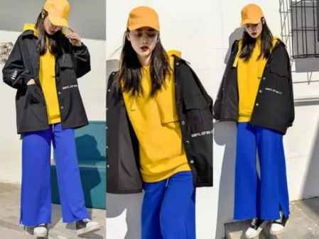 充满青春、活力的装扮,黑色风衣搭配**连帽卫衣,裤子选择了一条蓝色阔腿裤,帽子的颜色和卫衣是一样的,不得不说这一身穿搭真是很吸晴抢眼呢,喜欢这样穿的妹纸大胆尝试吧!