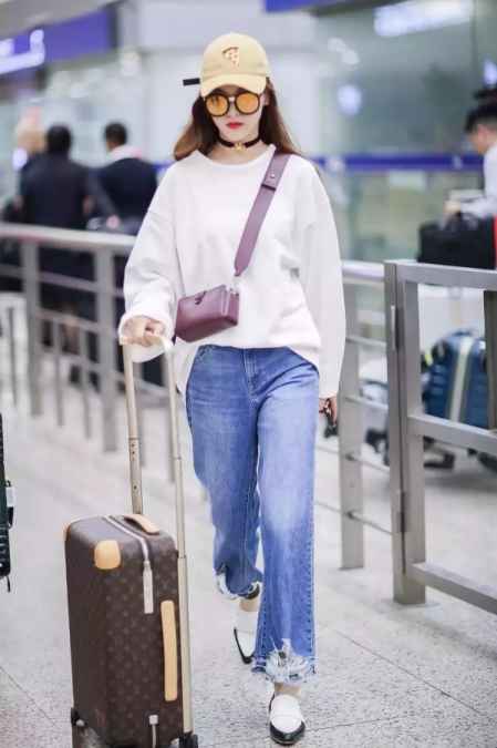 王鸥机智的把卫衣尾部**牛仔裤阔腿裤中,尽显大长腿的优势。这种大宽阔腿还特别的有气场,搭配上一张大红唇更是出彩不少。