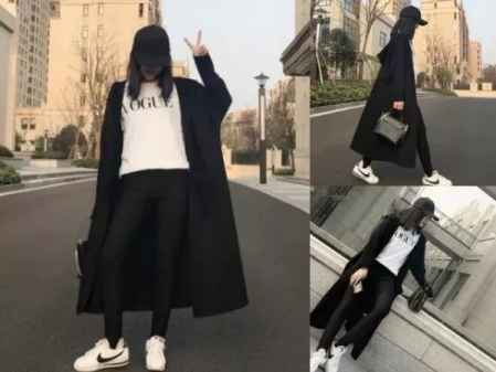 黑白配这样的穿搭无论在啥时候都那么时尚经典,过膝长款黑色风衣,在早春穿上也格外合适,内搭选择一件白色套头卫衣+黑色小脚裤+白色运动鞋,咋样?是不是休闲又不失帅气呢?