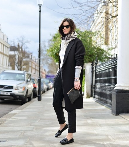 豆豆鞋搭配方法三: 豆豆鞋配上九分裤,加一件白衬衫,自信而又舒适。